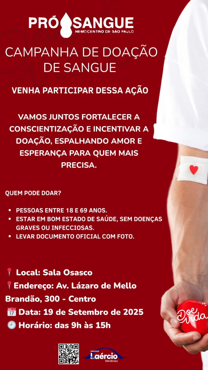 “Doar sangue é um ato de solidariedade e salva vidas.” Com essa frase, o vereador Laércio Mendonça (PDT) tem divulgado a campanha de doação de sangue que organiza em parceria com a Fundação Pró-Sangue. No próximo dia 19, das 9h às 15h, a equipe do hemocentro de São Paulo estará na Sala Osasco para reforçar os estoques do banco de sangue do estado.