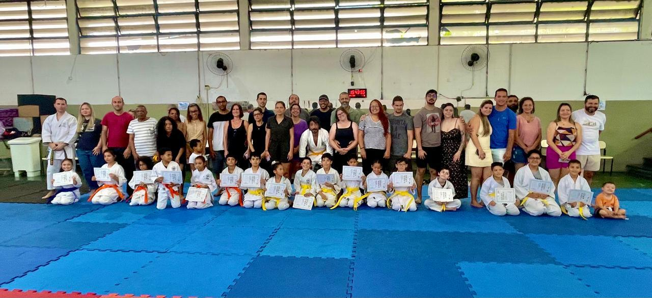 Com grande orgulho, as 18 crianças obtiveram êxito total em suas avaliações e foram promovidas à próxima faixa, validando o trabalho de base realizado na academia municipal.